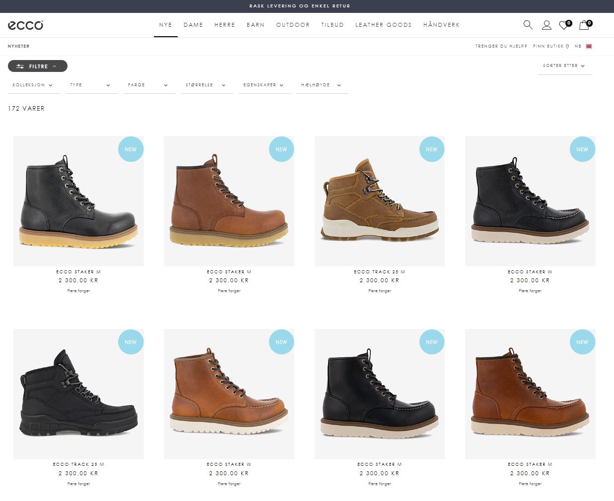 Skal du handle varemerket ECCO kan du for eksempel bruke den offisielle nettbutikken deres. Her får du deres fottøy og vesker av høy kvalitet og du kan alltid være sikker på at produktene er ekte og det «siste». I ECCO butikken kan du med letthet oppdage nye damesko, herresko, baby- og barnesko samt fritidssko i kategoriene Outdoor, sandaler, golfsko, tur og trekking.