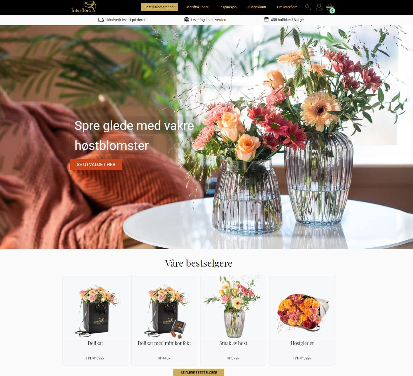 Interflora.no er nettbutikken til blomsterbutikkkjeden Interflora med over 400 fysiske butikker. Her kan du bestille blomster til alle anledninger som gratulasjoner, blomsterhilsen, buketter, dekorasjoner, sommerblomster, gaver, planter og mye mer. Kjøp også blomster innen kategoriene alstromeria, orkide og roser. Hvorfor ikke overraske noen du er glad i helt tilfeldig med blomster? Du vil garanter gjøre dem veldig glade.