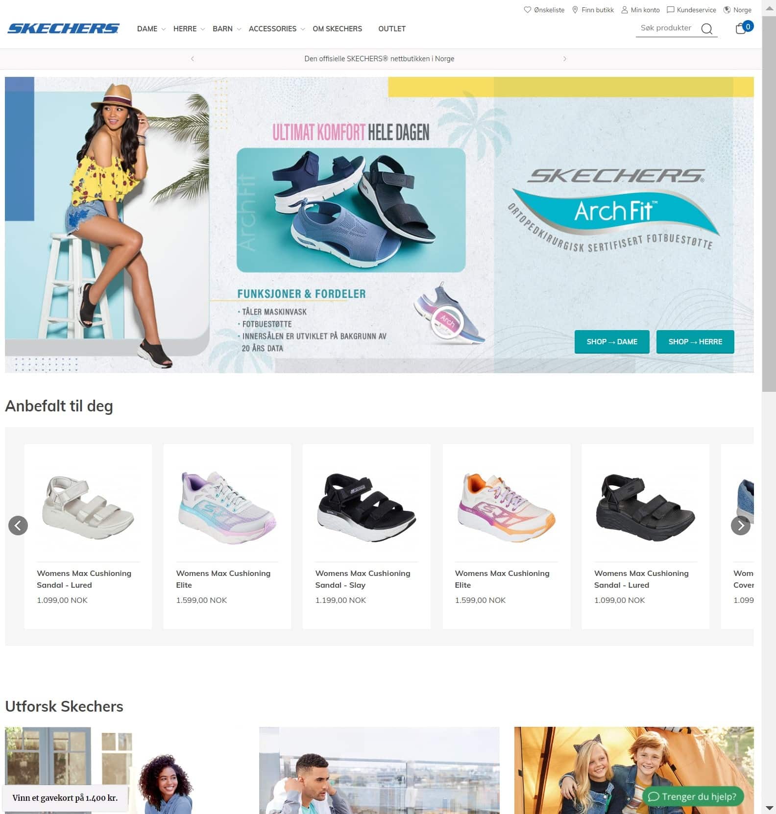 I Skechers sin offisielle nettbutikk i Norge kan du kjøpe de populære og komfortable skoene deres for herre, dame og barn. Her får du deres sko, sandaler, støvler, slip-ons, ballerinasko, tøfler, strømper og barnesko. På nettsidene kan du sortere på aktiviteter som løping, spasering og golf. De har også noe fitness- og treningsutstyr. Varemerket får du også i hundrevis av butikker i Norge.